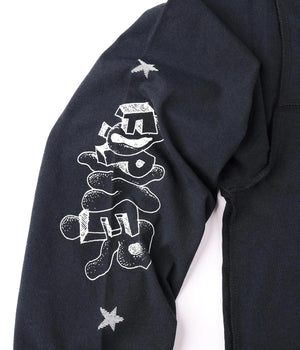 Delivered in a premium 200GSM jersey cotton and delivered in our standard FORMER long sleeve T-shirt block for a regular fit. Featuring inverted seams at collar and cuff and a cut and sew chest panels with cover stitch detail. Delivered with cracked print front graphic and sleeve graphics in a soft hand plastisol screen print.
