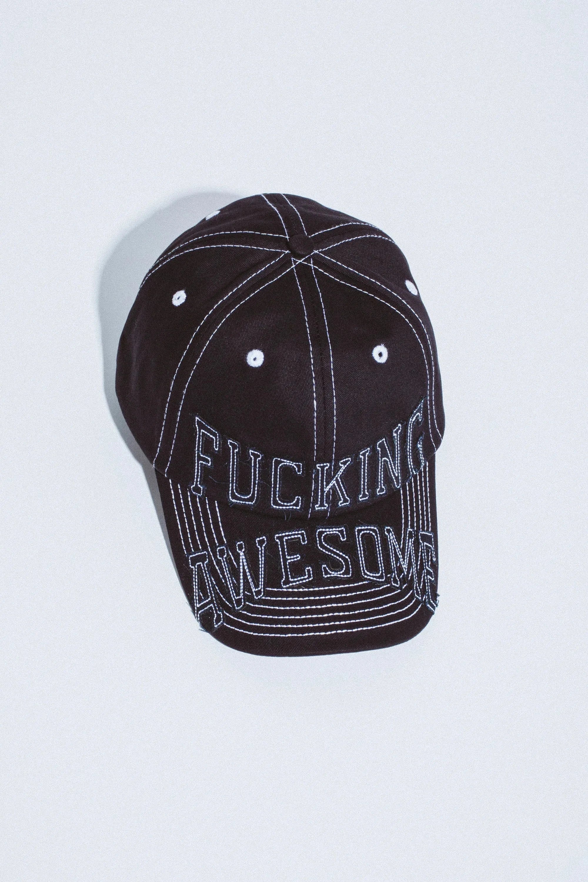 6-Panel "Dad Hat" Style with Adjustable Buckle Strap. Die-Cut Self Fabric "Fucking Awesome" Logo on Front Panel & Visor. Contrast Stitching all Throughout.